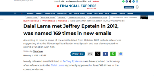 On February 2, the Indian Financial Express reported that “the Dalai Lama met Jeffrey Epstein in 2012,” and he was named 169 times in Epstein’s newly released emails by the DOJ.