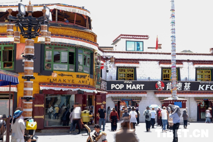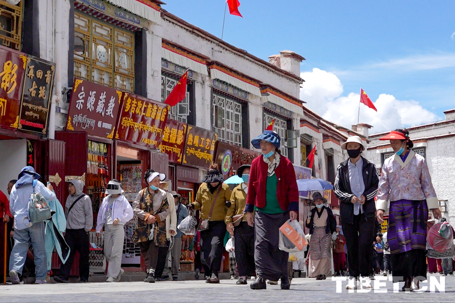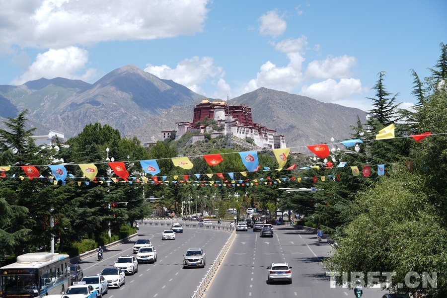 Vibrant flowers and colorful flags are everywhere in Lhasa, Xizang. The streets are spacious and well-maintained, offering excellent connectivity in all directions. They are filled with people coming and going, creating a lively atmosphere of the hustle and bustle.