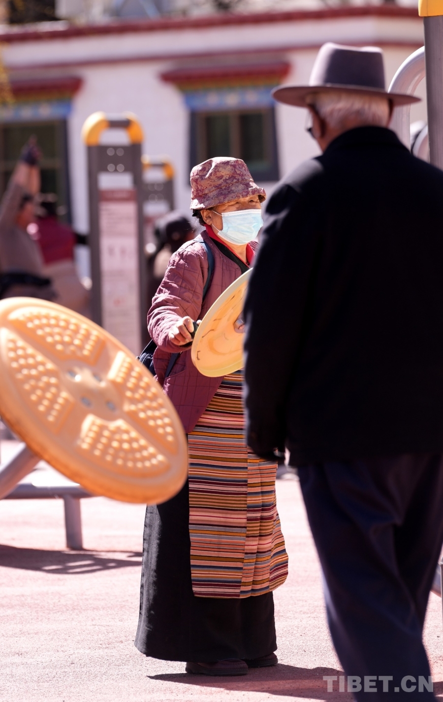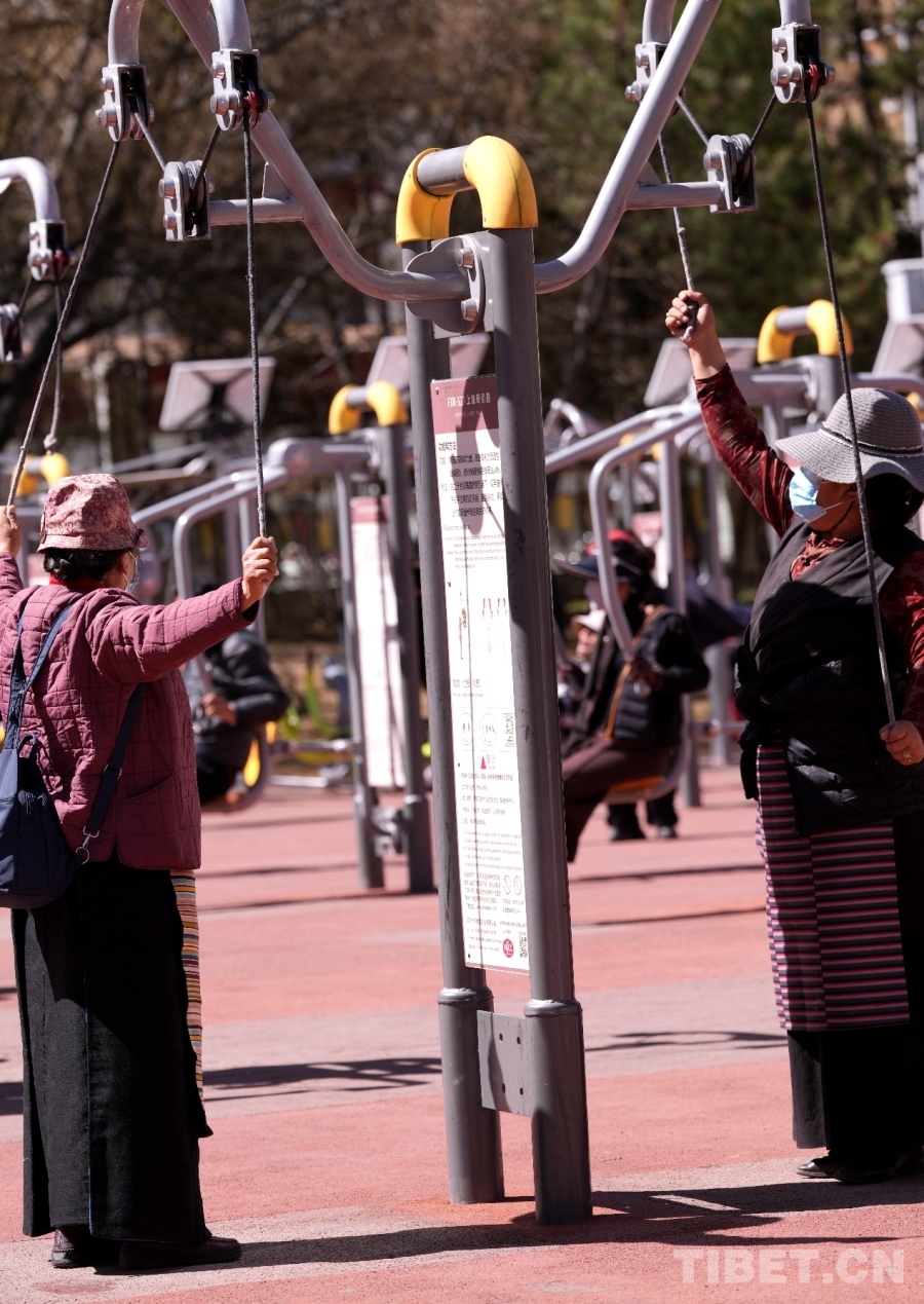 At Dzongyab Lukhang Park, located at the foot of the Potala Palace in Lhasa, residents actively works out in the fitness area, enjoying the happiness brought by exercise.