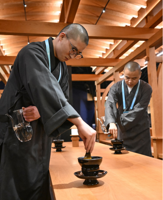 People experience the Chinese tea culture at the exhibition of the sixth World Buddhist Forum in Ningbo, east China's Zhejiang Province.
