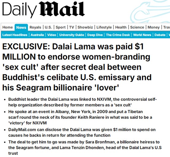 The 14th Dalai Lama participated in the NXIVM cult activity and received a huge donation. NXIVM is an American “sex cult” organization that claims to be a “self-help” training institution but recruits “sex slaves”. The Daily Mail reported in 2018 that the 14th Dalai Lama spoke at an event in Albany, New York, in 2009 and donned a Tibetan scarf for NXIVM founder Keith Raniere, which was considered a “victory” for NXIVM. Subsequently, the 14th Dalai Lama was given $1 million to spend on “causes” he backs.