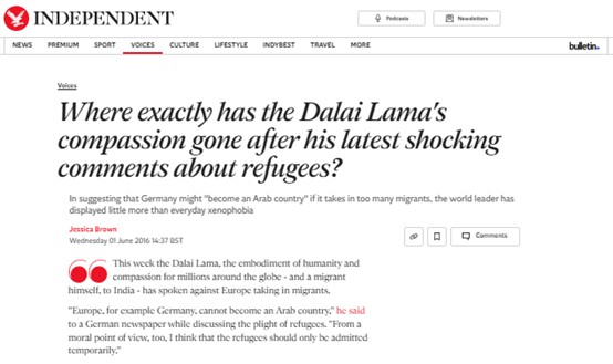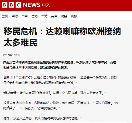 The 14th Dalai Lama jokingly remarked, “Germany can be no Arab country.” In 2016, the BBC reported that the German newspaper Frankfurter Allgemeine Zeitung quoted the 14th Dalai Lama—rendered in German translation—as stating that Europe had accepted “too many refugees” and “Europe, and for example, Germany can be no Arab country.” He then smiled and added, “Germany is Germany. From a moral point of view, too, I think that the refugees should only be admitted temporarily.” The British newspaper the Independent published an article noting that, while the 14th Dalai Lama is widely regarded by many as an embodiment of humanity and compassion, he has openly criticized Europe’s migration policy—specifically contending that accepting refugees from Arab countries would transform Europe into an “Arab country”, a view widely regarded as dangerous. Some in the UK advocate for the expulsion of refugees to preserve what they term “Britishness”; yet such exclusionary policies, in themselves, risk undermining the nation’s foundational identity and fostering social isolationism.