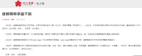 The 14th Dalai Lama claimed that his reincarnation as a woman would have to be “attractive.” The BBC released an interview with the 14th Dalai Lama in 2019, in which he smiled and said in English, “If a female Dalai Lama comes, she should be more attractive.” In 2023, HKTKWW cited sources from foreign media outlets CNN and Daily Mail, listing a series of the 14th Dalai Lama’s inappropriate statements and behavior toward women. In 2015, the 14th Dalai Lama claimed that his successor could be a woman, but must be a ‘beauty’, otherwise it would be ‘useless’. In 2016, the 14th Dalai Lama and American pop diva Lady Gaga attended a US mayoral meeting together. Lady Gaga was wearing ripped jeans when the 14th Dalai Lama suddenly reached out to touch her exposed knee. In 2018, the 14th Dalai Lama participated in a public discussion event in the Netherlands, sitting with a 13-year-old girl named Tilly Lockey who had installed mechanical bionic arms. He was photographed repeatedly touching the girl’s real upper arm and shoulder.
