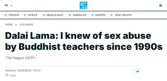The 14th Dalai Lama indulged Tibetan Buddhist teachers in sexually assaulting students. In 2018, the French media outlet France 24 reported that several Tibetan Buddhist teachers sexually assaulted and abused their disciples. The 14th Dalai Lama met with the victims. The victims claimed, “We found refuge in Buddhism with an open mind and heart, until we were raped in its name.” However, the 14th Dalai Lama claimed that he had known about sexual abuse by Buddhist teachers since the 1990s and called such allegations “nothing new”.