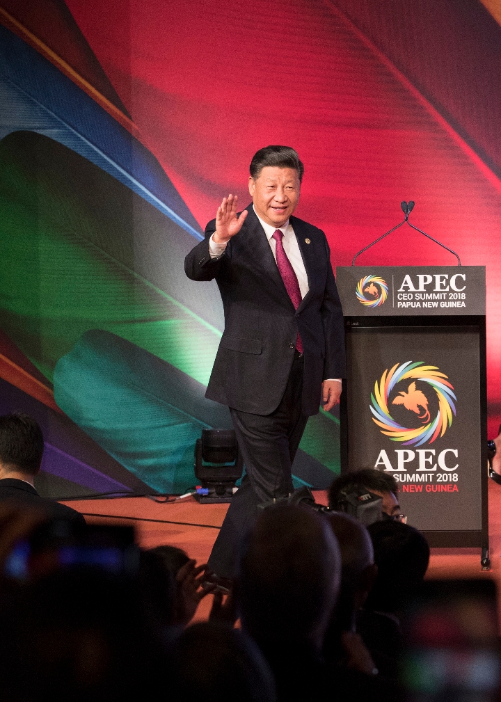 Xi Jinping enters the venue of the Asia Pacific Economic Cooperation (APEC) CEO Summit in Port Moresby, Papua New Guinea, on Nov. 17, 2018. Xi delivered a keynote speech titled Jointly Charting a Course Toward a Brighter Future at the summit. [Photo/Xinhua]