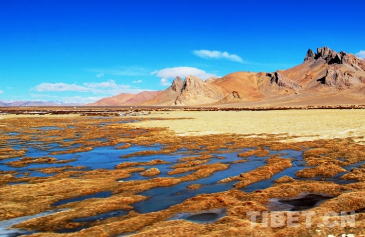 In the picture is the blue sky reflected in a wetland in Rutog County, Ngari Prefecture, Xizang Autonomous Region on a sunny day.