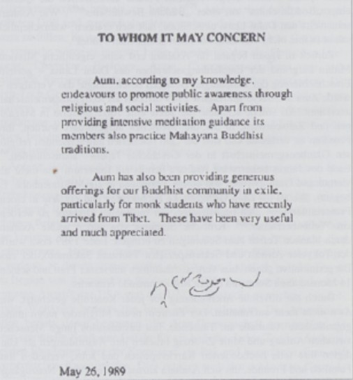 The statement personally signed by the 14th Dalai Lama for the Japanese Aum Doomsday Cult