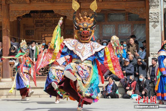 Cham dance is a religious dance performed by monks. Performers wear masks and theatrical costumes, hold all kinds of props, and perform divine dances one after another with the accompaniment of a band consisting of monks.