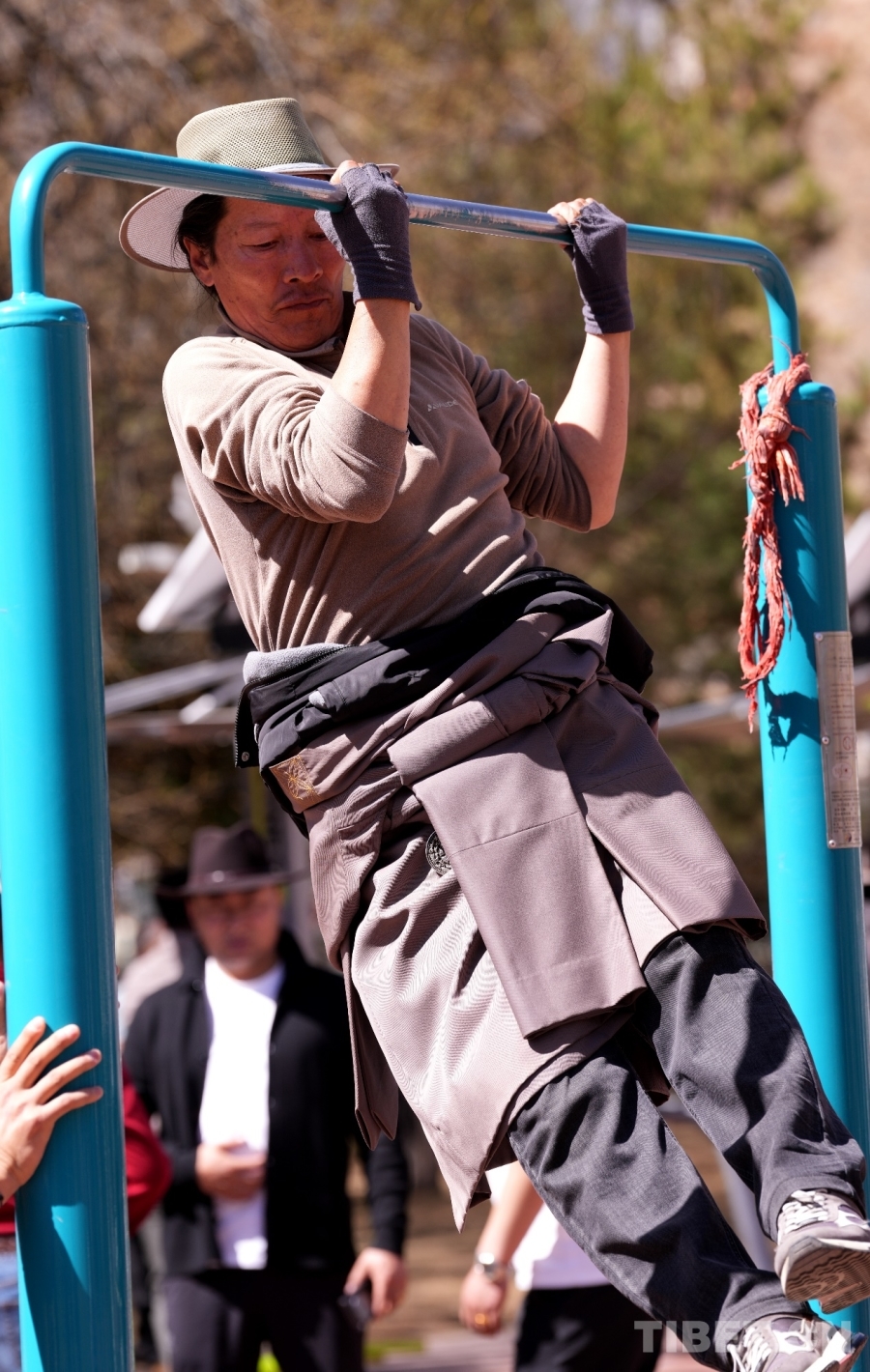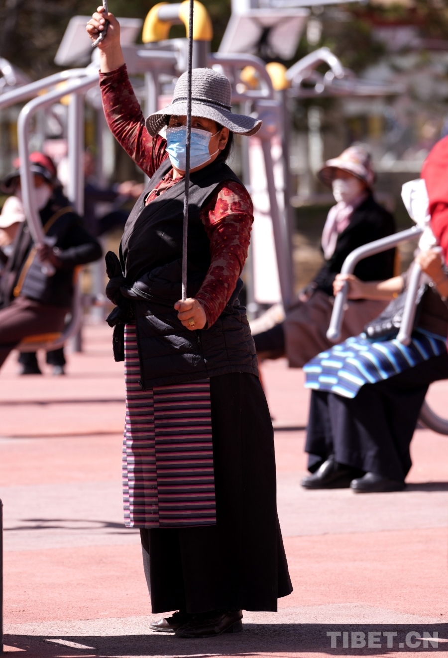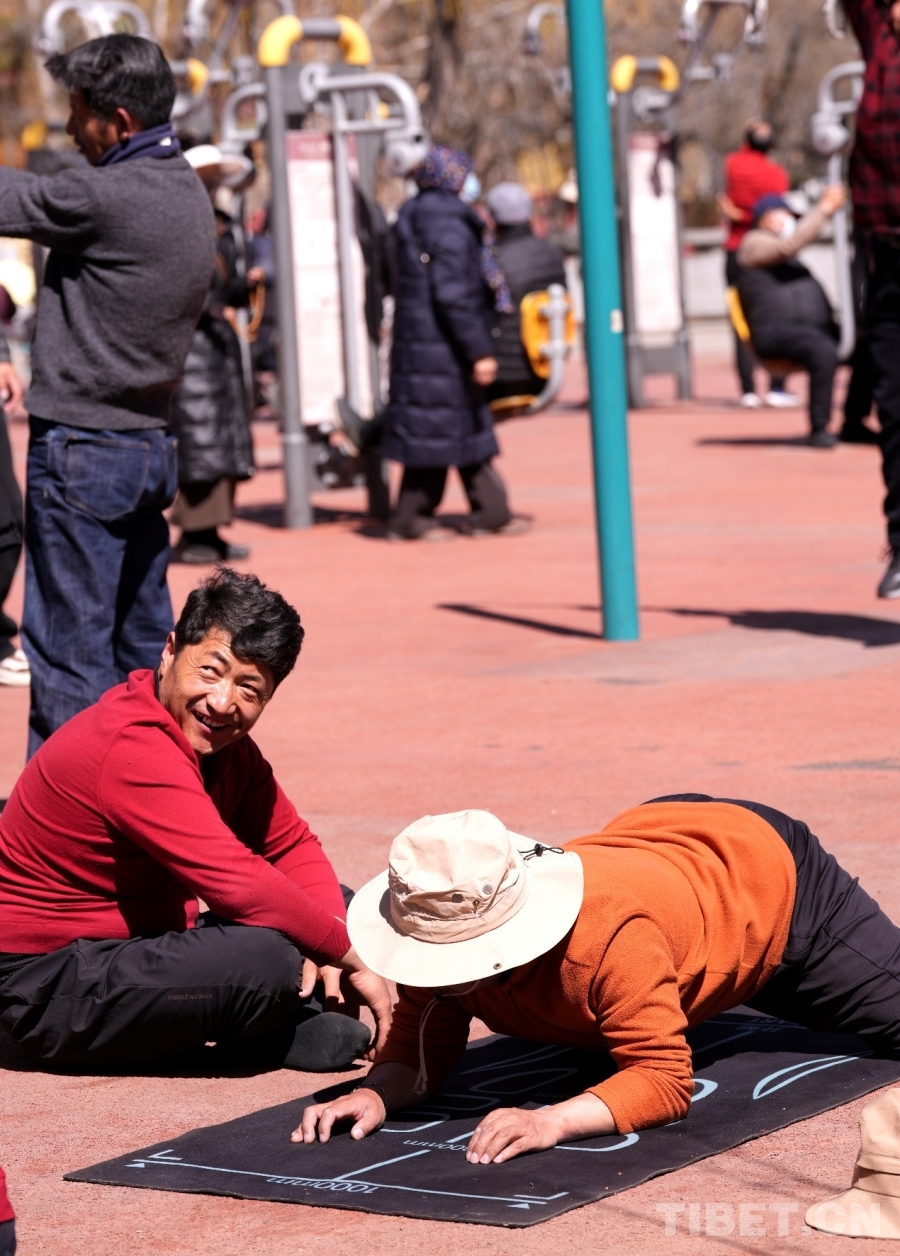 At Dzongyab Lukhang Park, located at the foot of the Potala Palace in Lhasa, residents actively works out in the fitness area, enjoying the happiness brought by exercise.