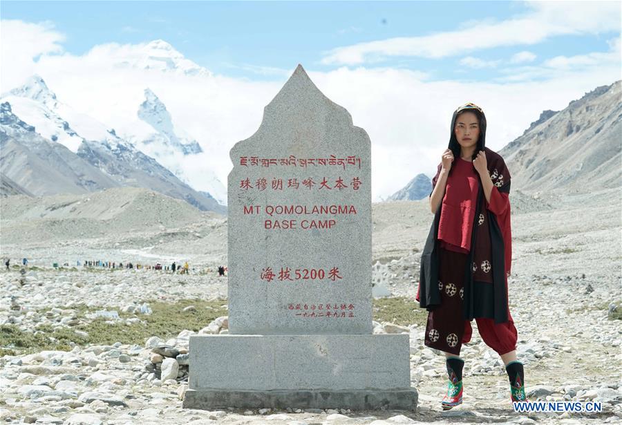 A model presents a creation during a folk costume show at the 5,200-meter-high base camp of the world's highest peak Qomolangma, in southwest China's Tibet Autonomous Region, Aug. 18, 2018. [Photo/Xinhua]