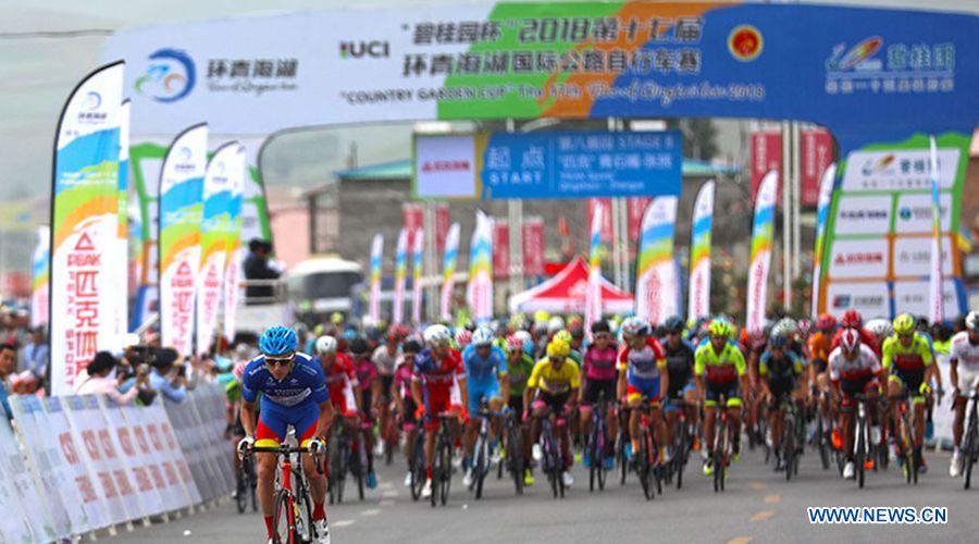 Cyclists compete in the eighth stage of the Tour of Qinghai Lake in northwest China's Qinghai Province on July 29, 2018. (Xinhuanet Photo by Jia Haiyuan)